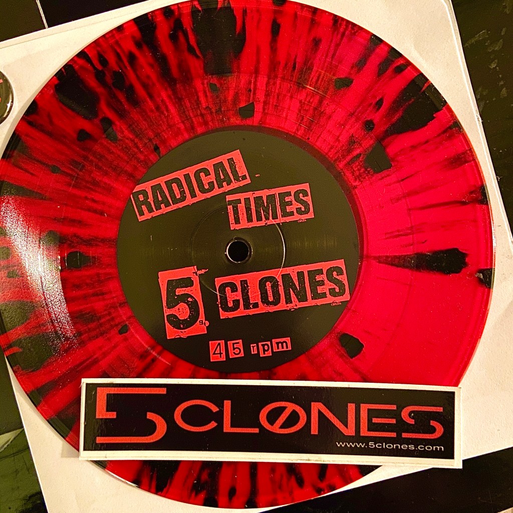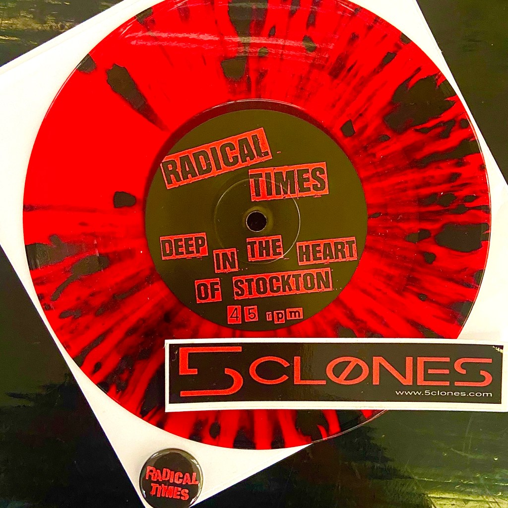 After Ed finished 5 Clones his band, Radical Times, decided to write a song for it. The 5 Clones theme came out so well that they released it as a single. You can buy it on a lovely little 45 in translucent blood red vinyl with black drips. A Side: 5 Clones, the theme song for the book. B Side: Deep in the Heart of Stockton, Radical Time’s love song written to their hometown of Stockton California. Each record comes with a Radical Times pin and a 5 Clones sticker. Click on a pic to buy while supplies last. Only 200 available and they are selling fast.