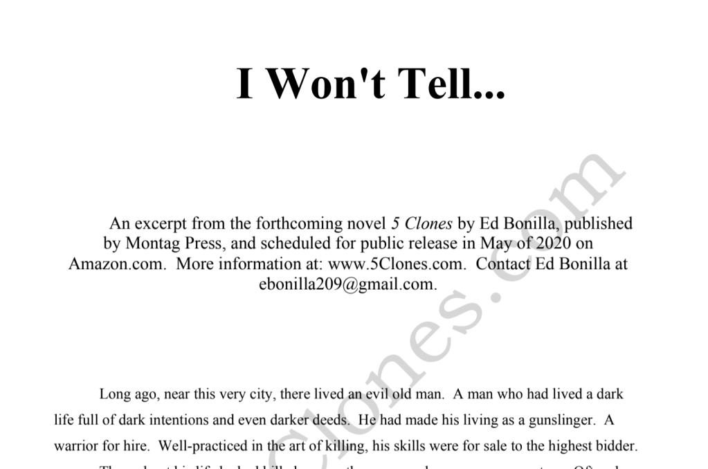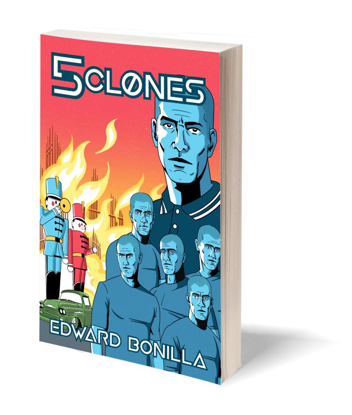 Told from multiple points of view, 5 Clones is an epistolary tale which takes place at a time when California and Texas are seceding from the United States amidst growing environmental and political disasters. Dan, a former pot farmer from Colorado, is driving across the New Federal Union (NFU) to California to sell his five clones which were created in a Federal lab to be loyal low intelligence farm hands for him. Along the way he picks up a beautiful, mysterious woman named Mary. When she is suddenly shot at an NFU checkpoint in Reno, it becomes obvious that she is being hunted by a deadly assassin whose weapon of choice is autonomous military attack drones. As Mary and Dan attempt to covertly enter California, one of Dan’s clones, who was never considered to be capable of speech, starts waking him up in the middle of the night to tell him strange fables.